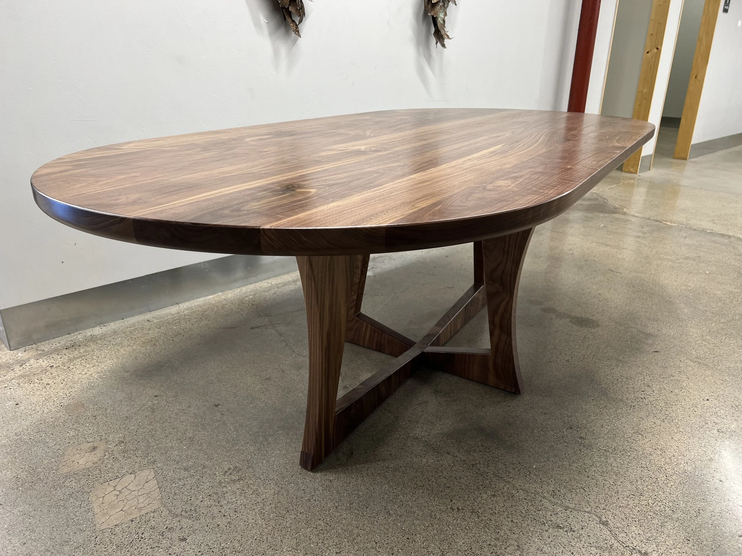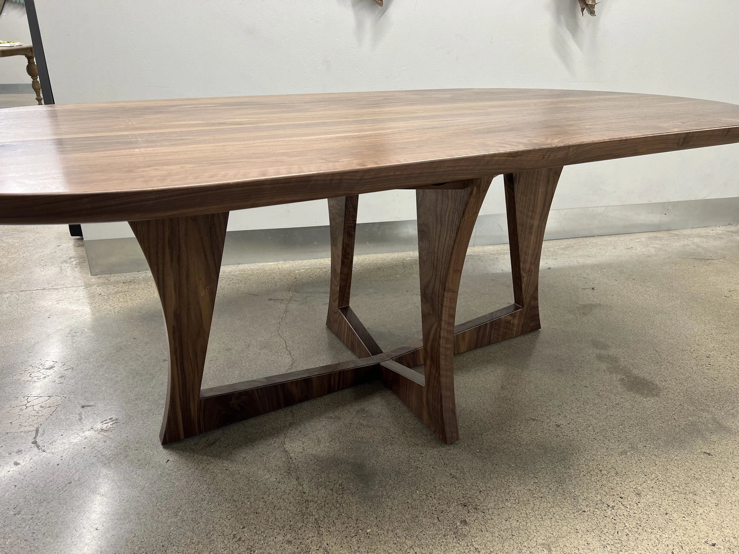 Salerno is a beautifully handcrafted solid walnut table, featuring a pill shaped tabletop with rounded underside. The custom legs are a very minimalist design.