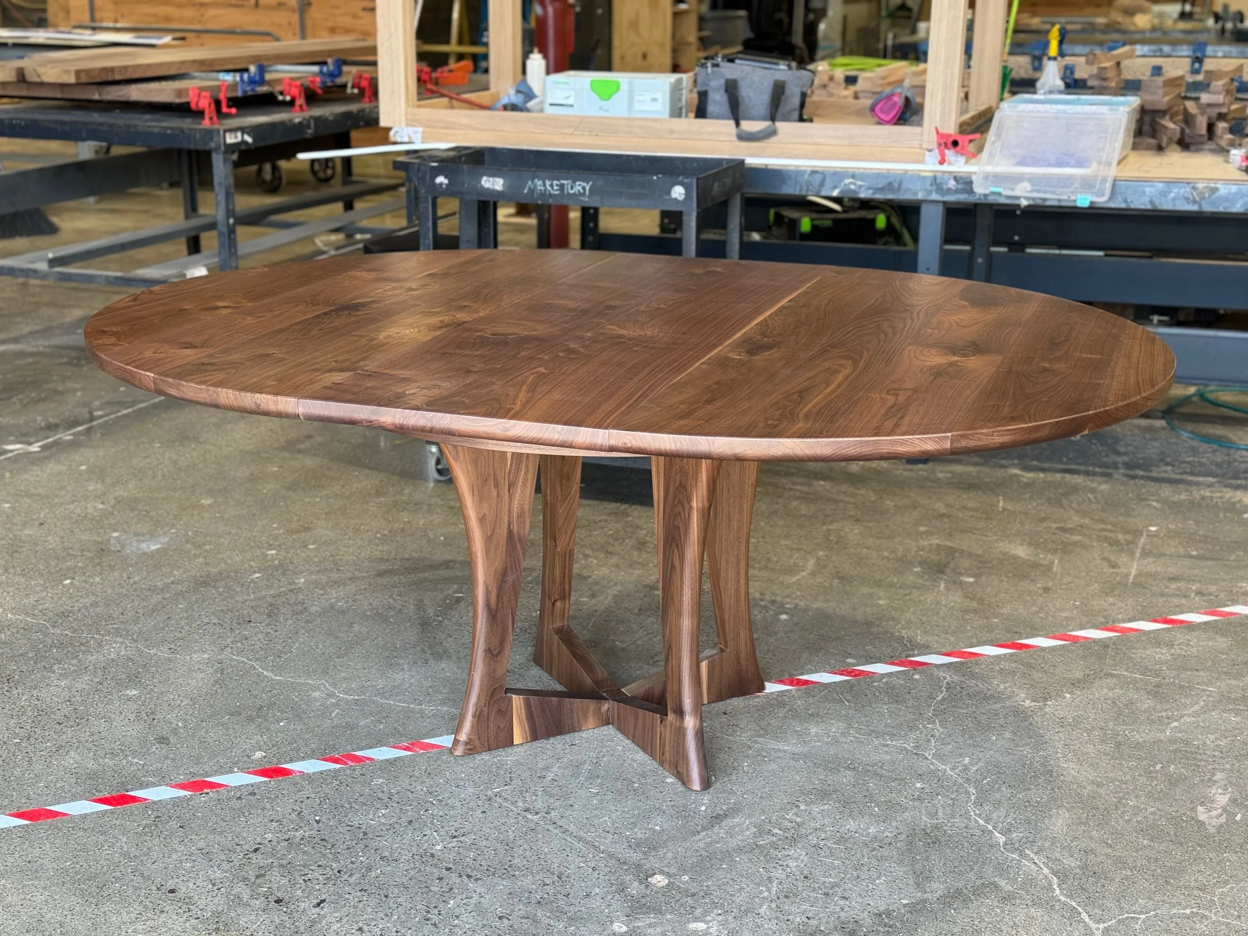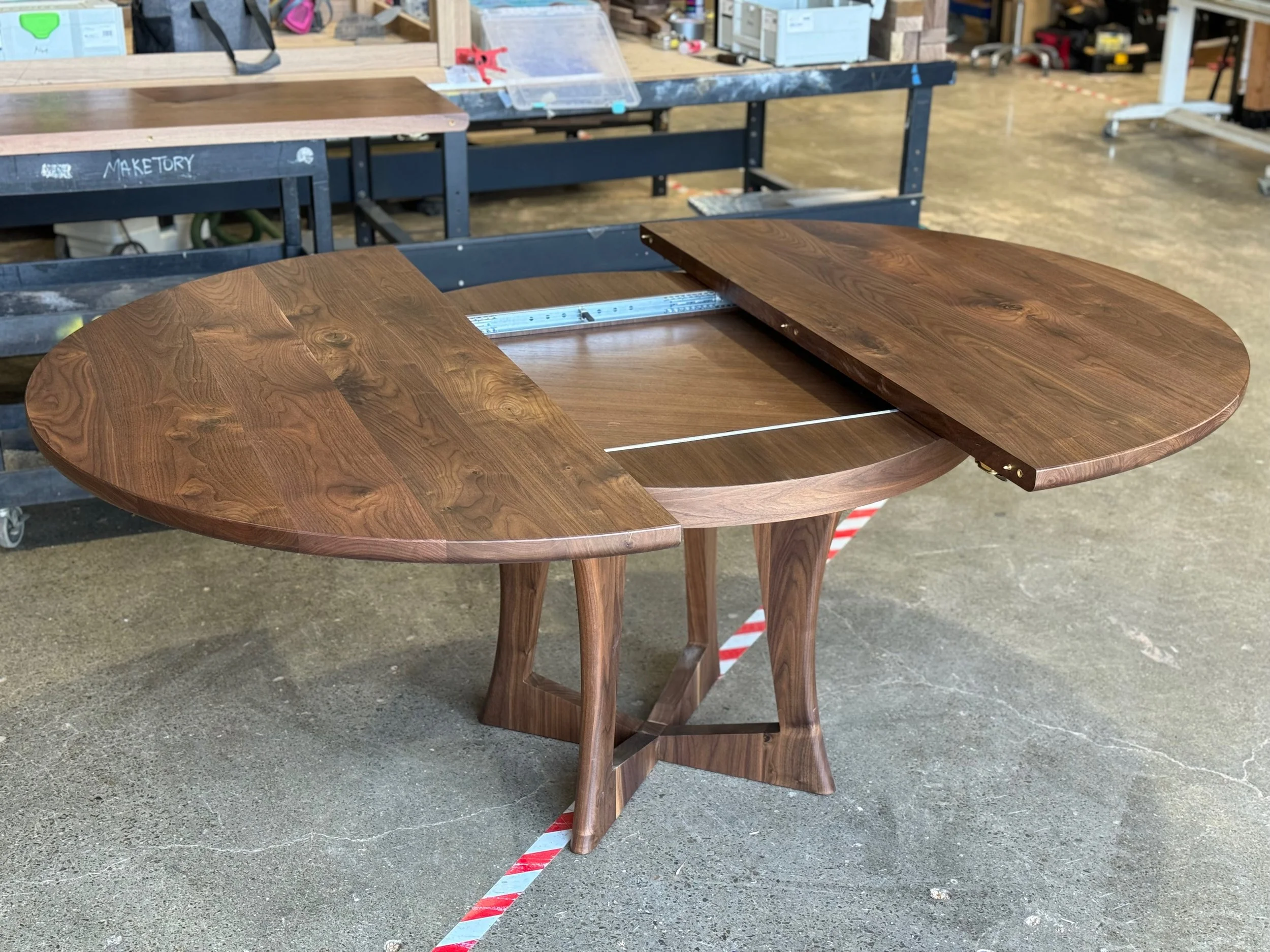 Pictured in walnut. Dimensions- 48” diameter with 24” extension x30H”